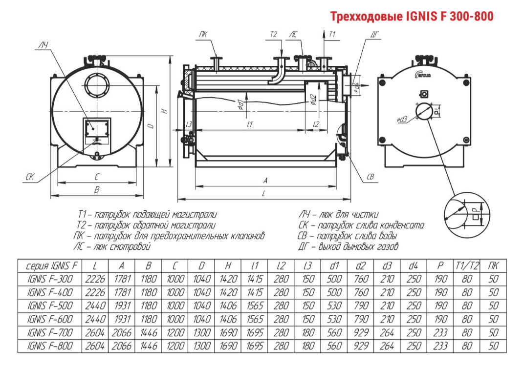 Технические характеристики водогрейного трёхходового котла ARCUS IGNIS F-300