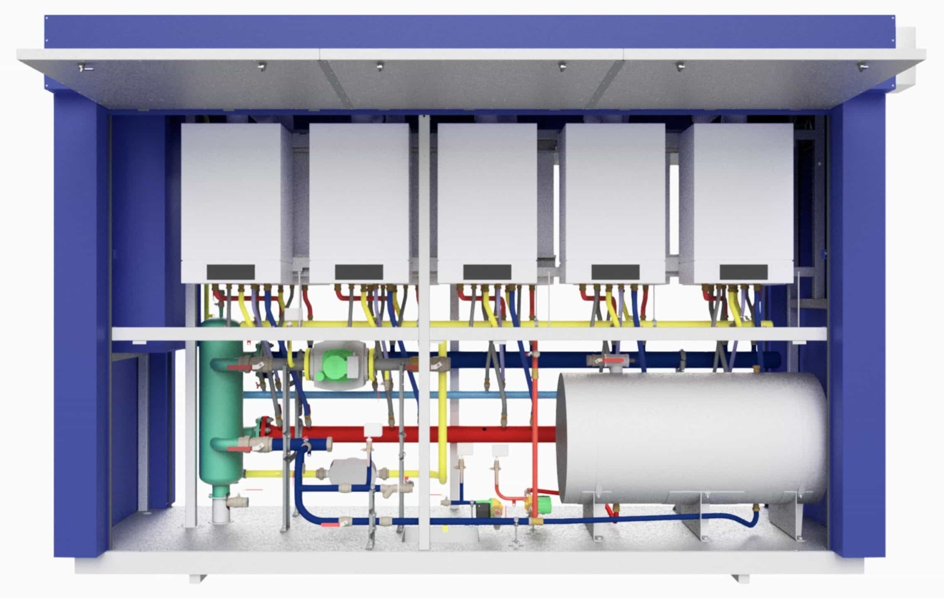 В котлах ТГУ-НОРД применяется каскад бытовых настенных двухконтурных котлов Mizudo M30T мощностью 30 кВт каждый. Это обеспечивает температурный график контура ОВ 60/80°C.