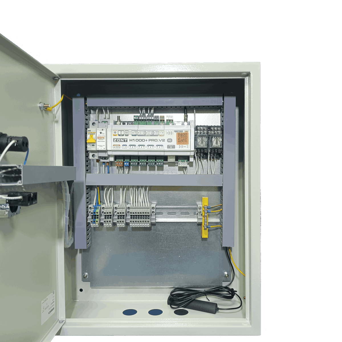 Готовый шкаф автоматики Zont для котельной в металлическом корпусе  Внутреннее устройство шкафа управления котельной Zont: программируемый контроллер, электромагнитные пускатели, клеммные ряды и защитная автоматика Шкаф управления котельной на базе Zont с установленным блоком бесперебойного питания и многоступенчатой системой защиты автоматики  Установленный на стену шкаф автоматики Zont с открытой крышкой